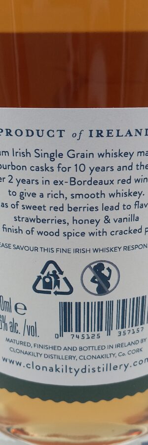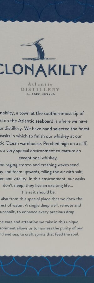 10 Jahre lagerte der Whisky erst in ex-Bourbon Fässer um dann ein 2 Jahres Finisch in ex-Bordeaux Fässern zu erhalten. Die Lagerung unter Atlantikeinfluss in West-Cork bedingt einen runden, milden Whisky, der mit fruchtig-beerigen Noten daherkommt.